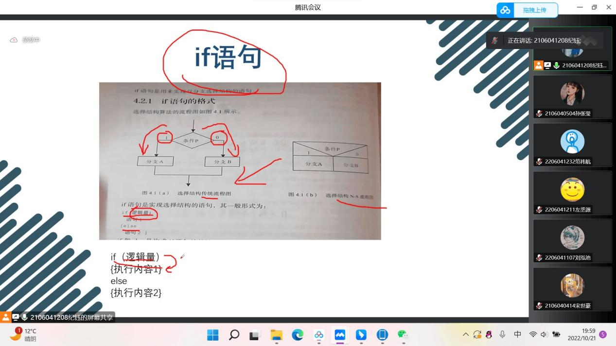 本次为第四组第二次科普培训,主讲人为21级纪钰,部分实验室骨干和22级实验室新成员参加了本次科普培训。本次科普培训为线上进行,纪钰学姐为大家讲述了C语言中数据,顺序结构,选择结构这三个主要的模块,包括但不限于if语句,Switch语句等一些重要的语句结构,并为大家进行了上机演示,大家也积极提出自己遇到的问题,并且在学长学姐的帮助下解决了问题,学习氛围十分良好。