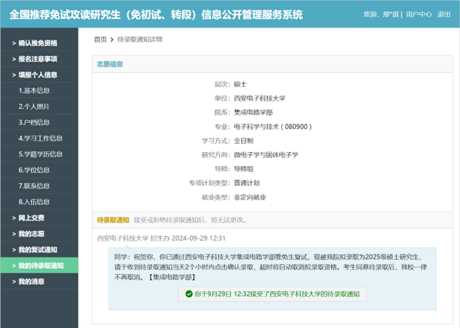 电子科学与技术专业21060242班学生,平均学分绩点4.16,综合绩点4.36,专业排名6/149;曾获国家励志奖学金、综测一等奖学金,以及优秀共青团员、优秀志愿者等荣誉;我始终谨记校训“致知于行”,坚持以赛促学,积极参加学科竞赛,累积获国家级奖项1项,省部级奖项6项;在大学的学习生涯中,我始终保持着对知识的强烈渴望和严谨的学习态度,通过系统的专业学习,我积累了扎实的专业知识,为进一步深造奠定了坚实的基础,现我已推免至西安电子科学与技术大学集成电路学部攻读硕士研究生学位。