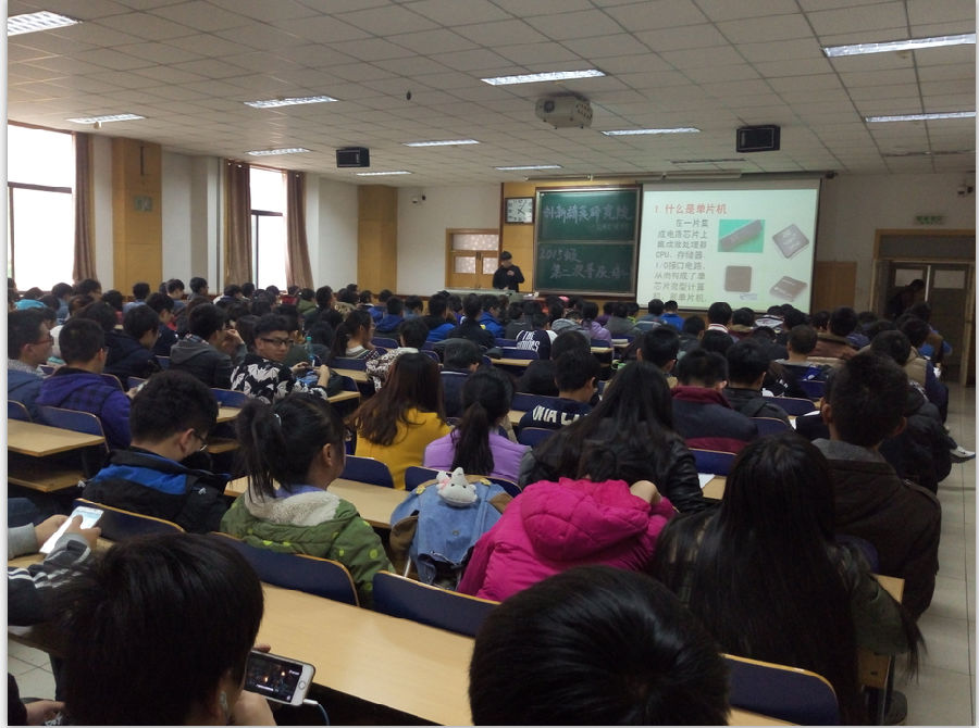 2015年11月29日在09201H开展了我院第二期“2015级新生创新普及培训”,本次培训由闫晓燕老师组织开展、创新精英研究院普及副院长薛伟钊负责。培训中黄宪坤,党立志学长分别向15级的电科,测控,微电所有到课新生以51单片机为例,详细的讲解了单片机的相关知识的及使用方法,带着大家进行了单片机使用的入门。