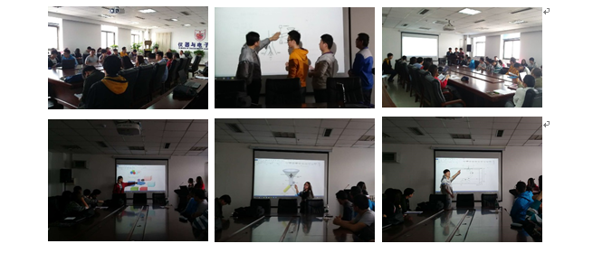 学生根据所选题目制定实践方案,方案要求结合实际情况。如“基于物联网的室内信息采集系统”实训方案,要求学生充分考虑实际住宅的结构、信息采集传感器的布置位置、安装供电等实际情况;“总线型温室大棚监控系统”实训方案,要求学生考虑温室大棚的实际条件,并考虑现代化温室大棚应该具备的功能等;“分拣机器人”实训方案,要求学生自主确定小球分拣结构,设计与电子控制系统相互配合的机械结构;三个题目均提出了拓展得分项。大部分学生在方案设计中都投入了大量时间和精力,对实训表现出了强烈的热情和信心。下图为组织方案评审现场,同学们、老师和同学进行了亲切热烈的交流,通过提问、解答、讨论,使得方案更加可行和完善。