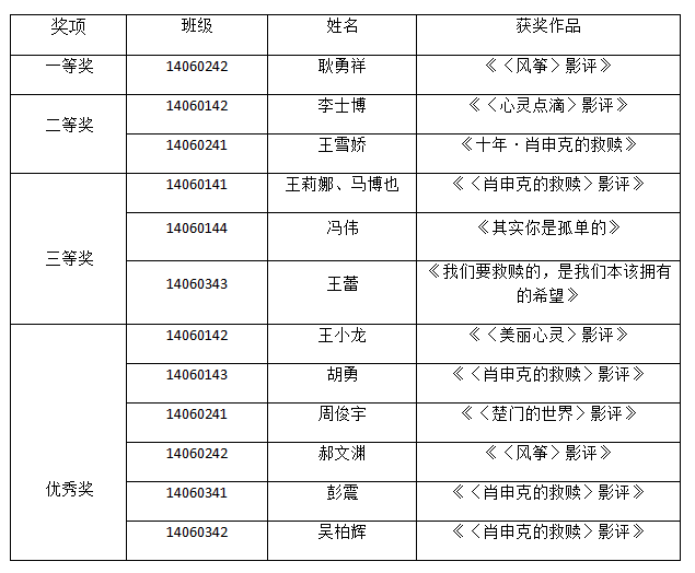我院“绘心阁”心理辅导站举办的十期优秀心理电影系列展播活动已经结束。在之后举办的“看影片,写影评”的活动中,同学们积极参与。我们共收到百余篇影评。经过“绘心阁”指导老师李红霞及各部部长审核、评选,我们选出一些洋溢着自己情感和理想的优秀作品给予奖励。现将评选结果公布如下: