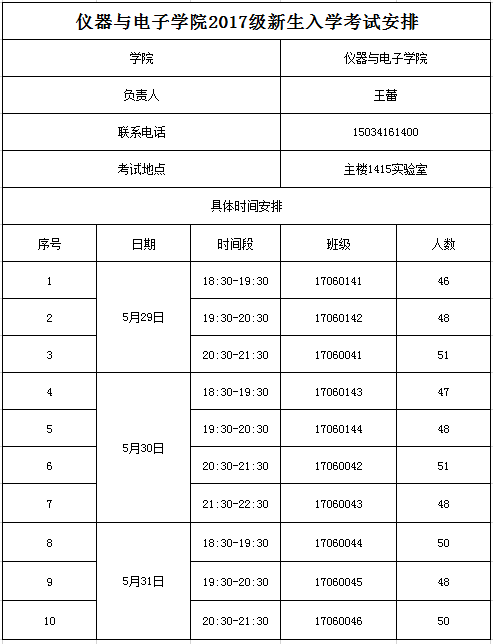 请参加新生入学考试的各位学生查看考试安排,要求携带本人身份证和学生证,提前30分钟到考场(主楼1415实验室)参加考试。