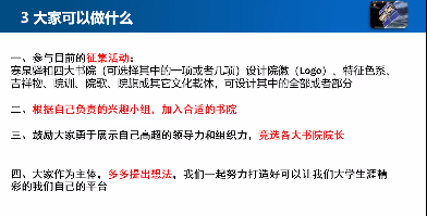 每场宣讲结束后,辅导员和班主任以及各年级学生都积极进行交流。大家分别围绕“如何参与”、“如何管理”、“如何获得积分”等内容进行了探讨。在聊天区的互动中,有的同学开始了现场的在线招募,有的甚至在线上就展开了招募演说。摄影、视频剪辑、写小说、做美食等等在学生中产生共鸣。因为热爱所以热烈。学生的教育就是激发学生的热情和热爱,让综合素质培养更能落地,更具实效。
