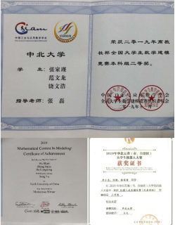 出于对数学建模的喜爱,大二寒假期间参加了美国大学生数学建模竞赛(Mathematical Contest in Modeling (MCM))。我与来自不同年级,不同专业的队友相互交流,共同进步,通力合作完成的论文《Modern life of the three dragons》荣获一等奖。通过此次竞赛,我不仅学会了利用数学工具分析解决问题的方法,锻炼了团队合作以及应对压力的能力,还提高了英文阅读及写作的能力,英文综合水平有了显著的进步。由于原队友毕业或者准备考研,我于2019年底组建起全新的队伍,参加 “高教社杯”全国大学生数学建模竞赛。在老师的指导下更加系统地学习了运筹学、图论、建模方法等课程,进一步掌握了 Matlab、SPSS、Lindo、Lingo 等软件的使用,最终凭借论文《“同心协力”策略研究模型》荣获国家二等奖。2019年还参与华北五省机器人大赛团队,并荣获国家三等奖。