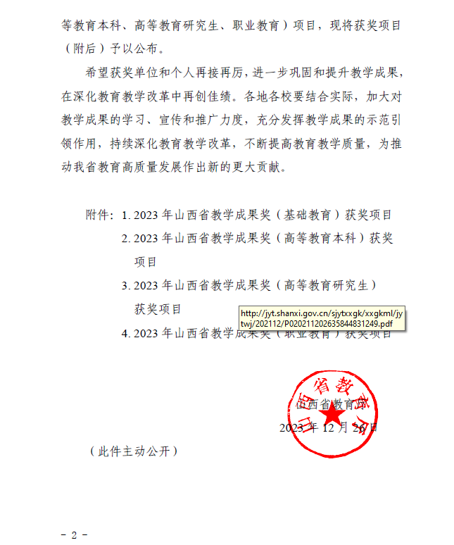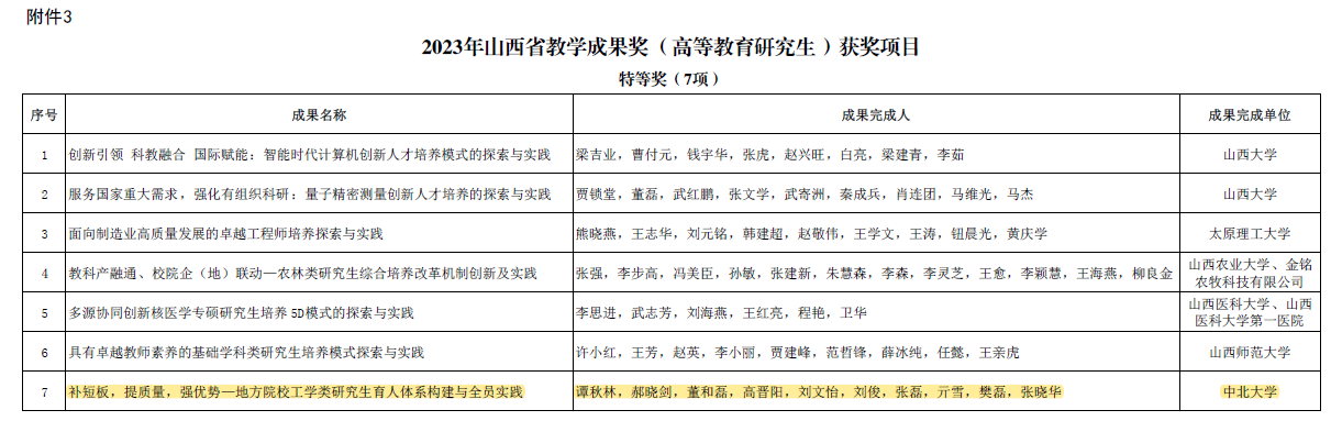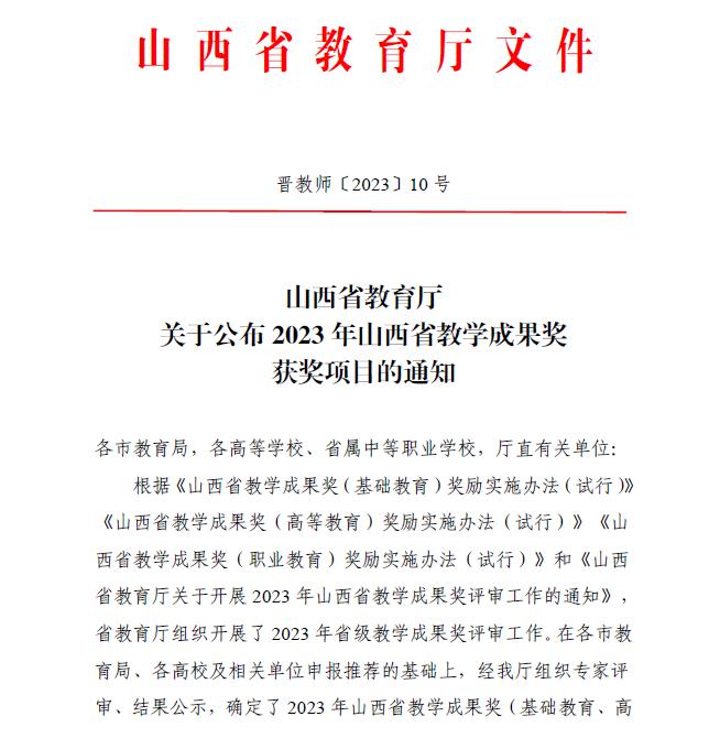 12月27日,山西省教育厅正式对外发布《关于公布2023年山西省教学成果奖获奖项目的通知》,我院获省教学成果奖特等奖2项、一等奖1项。其中,谭秋林教授牵头申报的研究生教学成果和刘俊教授牵头申报的本科教学成果获特等奖,郝晓剑教授牵头申报的本科教学成果获一等奖。