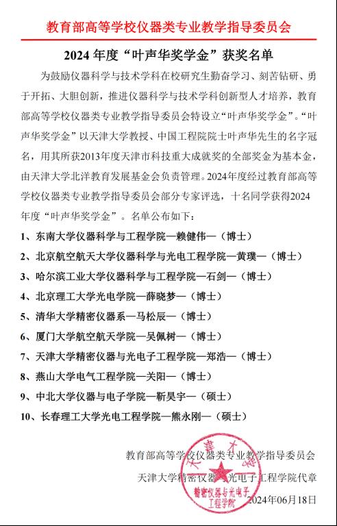 “叶声华奖学金”是教育部高等学校仪器类专业教学指导委员会为鼓励仪器科学与技术学科在校研究生勤奋学习、刻苦钻研、勇于开拓、大胆创新,推进仪器科学与技术学科创新型人才培养而设立的。奖学金以天津大学教授、中国工程院院士叶声华的名字冠名,旨在鼓励仪器科学与技术方向的在校研究生勤奋学习、刻苦钻研、勇于开拓、大胆创新,该项奖学金为仪器学科奖学金中最高荣誉。