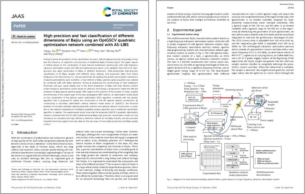 文章针对传统白酒分类精度低、数据处理难、分析时间长、主观意识影响大等问题,报道了一种基于高频超声雾化系统的激光诱导击穿光谱技术(AS-LIBS)与优化网格搜索交叉验证(Opt-GSCV)相结合的用于不同维度白酒高精度快速分类的方法,并与山西省杏花村股份有限公司合作,对23种不同系列、不同度数、不同生产日期的白酒进行多维度高精度分类。该项工作是由靳昊宇同学在研三期间完成,其所在的郝晓剑教授“中仪迅辉”科技团队始终坚持面向国家重大战略需求、面向人民生命健康,致力于高精度LIBS光谱探测技术研究、动态光电测试理论与溯源性校准、极端环境测试与光电仪器、多维场重建与动态信息重构。