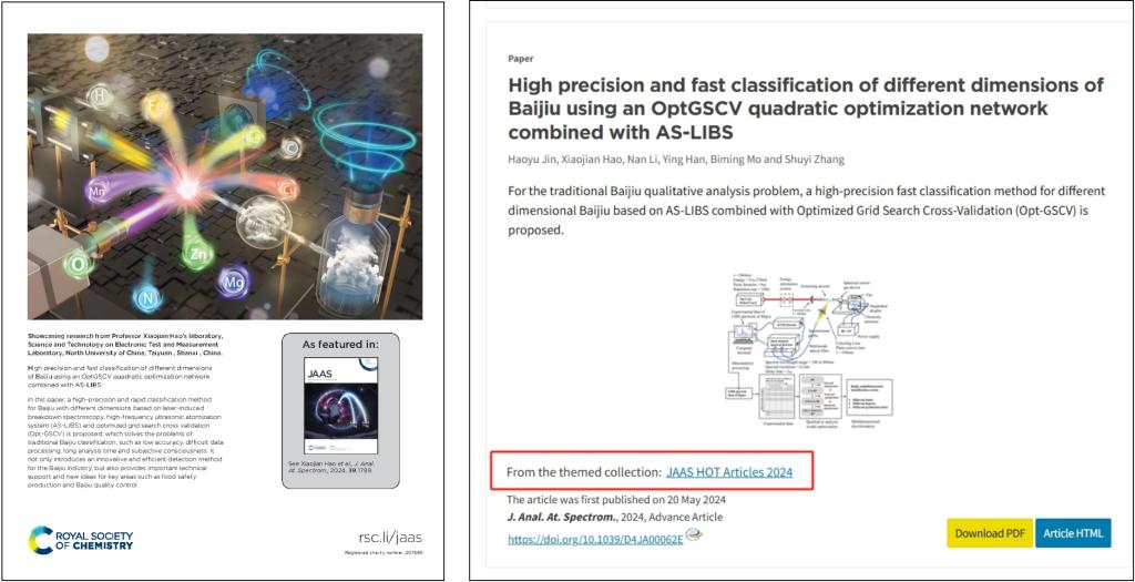 郝晓剑教授的指导下,2021级仪器科学与技术学科硕士研究生靳昊宇在硕士毕业前夕,作为第一作者在英国皇家化学学会旗下的国际权威期刊《分析原子光谱学杂志》(Journal of Analytical Atomic Spectrometry,光谱学1区)发表最新论文,被选为2024年7月份期刊封底论文,同时该论文入选2024-JAAS-Hot Article(该栏目现仅有18篇论文入选)。据悉,该同学在本期刊的另外一篇论文已在2023年11月被选为封面文章。