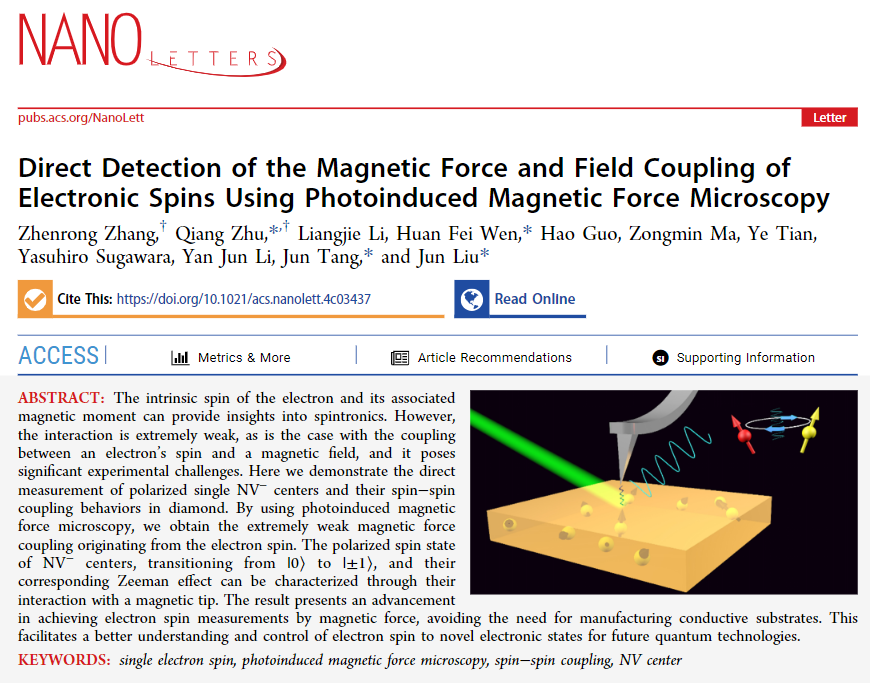 近日,国际权威杂志《Nano Letters》(IF=9.6)刊发了我院刘俊教授课题组题为“Direct detection of the magnetic force and field coupling of electronic spins using photoinduced magnetic force microscopy”的文章,报道了课题组在电子自旋纳米尺度成像表征方面的最新研究成果。该期刊属于美国化学学会旗下顶刊,专注于纳米科学与纳米技术领域的前沿研究。