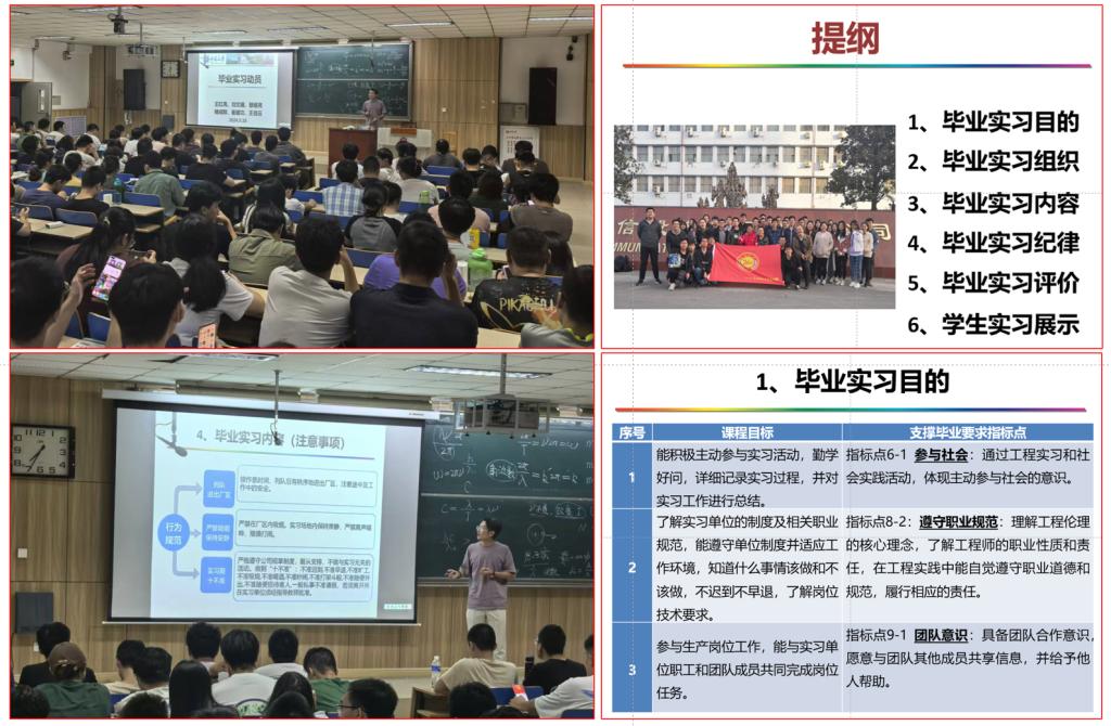 在9号教学楼102教室组织了毕业实习动员会,通过讲解实习目的和主要实习内容,强调实习过程中的纪律和安全问题,端正学生们的实习态度,激发实习积极性。毕业实习相关负责教师参与此次动员会。