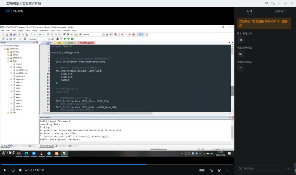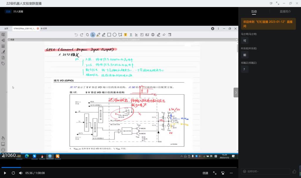 次培训的主讲人为雷喜骏,主要内容为对stm32 IO(按键与点灯)和软件延时部分进行讲解。首先,雷喜骏对于stm32GPIO进行了讲解,并且在原理图中画图详细讲解其工作原理,有的同学对这部分知识并不太理解,雷喜骏为他们进行了更详细的解释;然后,通过标准库结构体展现其功能,重点讲解如何声明与如何配置;最后,在cubemax平台,通过配置进行功能的实现,并借助示例程序进行详细的配置。