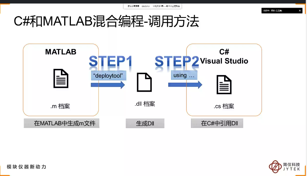 首先讲解了C#和MATLAB混合编程—调用方法,第一步先在MATLAB中生成m文件,第二步再生产DII档案,最后一步在C#中引用DII。王孟美对三个步骤再分别进行讲解,更深入地了解每个步骤的细节。
