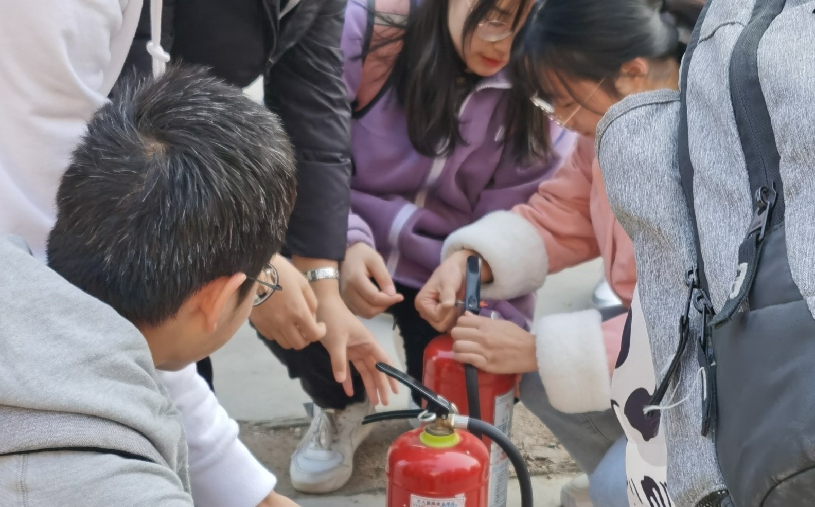 讲座结束后,参加演练的全体师生进行了应急疏散逃生演练。在实际演练中,在教官讲解完毕后,全体师生进入实战演习。当发生火灾时,听到声光报警器、警铃、警哨响起时,参练师生不惊慌、保持冷静,用水沾湿毛巾握住口鼻、俯下身,按照疏散指示标牌,安全出口指示标牌、走步梯,听从现场疏散引导员的指挥,迅速有序有效地按照逃生方法和路线,紧急疏散撤离到全地带,随后集合整队、清点人数,整体演练一气呵成。随后在10号教学楼前,向远峰老师对各种消防器材的使用进行了讲解和示范,并指导师生拿起灭火器进行灭火演练。