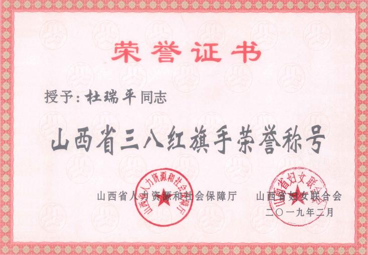 杜瑞平2019年2月荣获山西省三八红旗手荣誉称号