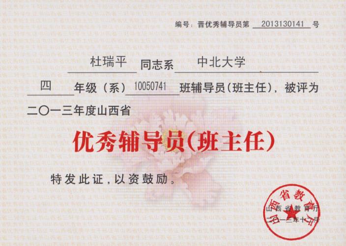 杜瑞平2013年12月荣获山西省优秀辅导员(班主任)