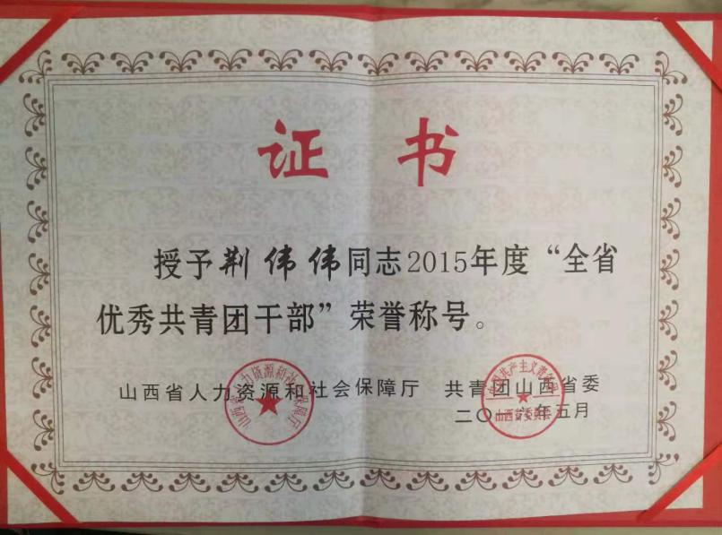 荆伟伟2016年荣获山西省“优秀共青团干部”