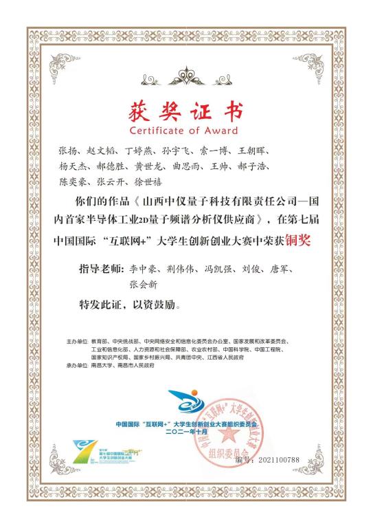 《山西中仪量子科技有限责任公司——国内首家半导体工业2D量子频谱分析仪供应商》荣获第七届中国国际“互联网+”大学生创新创业大赛铜奖