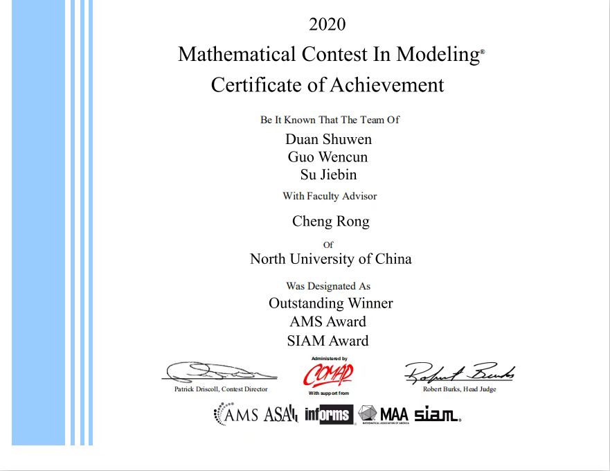 段树文、郭文村、苏杰斌三位同学组成的参赛队伍,获得美国大学生数学建模竞赛最高奖项O奖