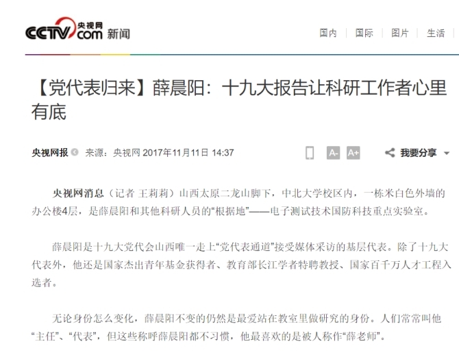 2017年11月11日,央视网发布【党代表归来】薛晨阳:十九大报告让科研工作者心里有底