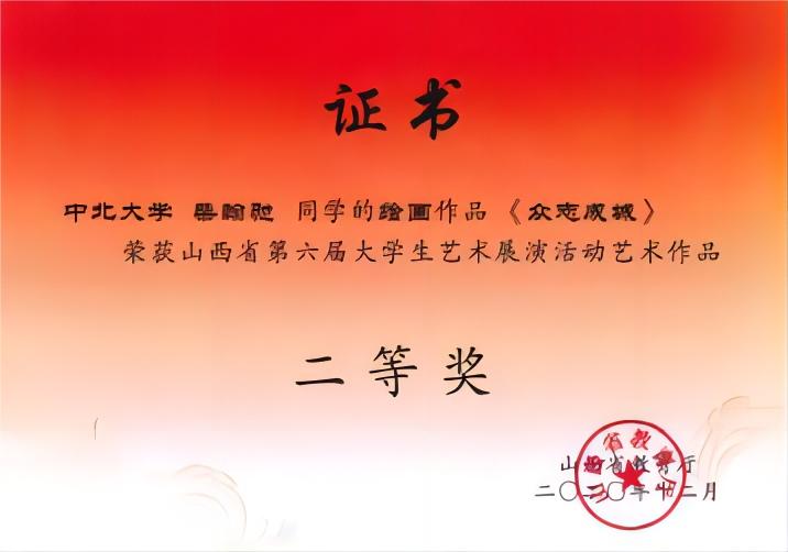2020年柴翰驰同学获山西省第六届大学生艺术展演艺术活动艺术作品绘画类二等奖