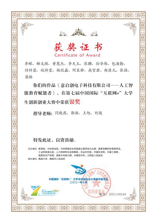 2021年“意启创电子科技有限公司——人工智能教育赋能者”-第七届中国国际“互联网+”大学生创新创业大赛国家级银奖