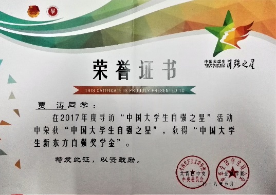 2017年贾涛同学获“中国大学生自强之星”荣誉称号
