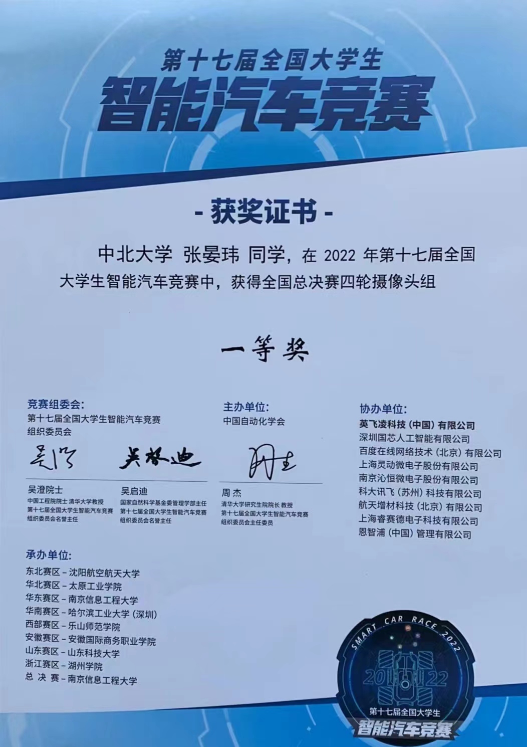 “智能车汽车竞赛”国家一等奖:性爱片 张晏玮同学,在2022年第十七届全国大学生智能汽车竞赛中,获得全国总决赛四轮摄像头组一等奖