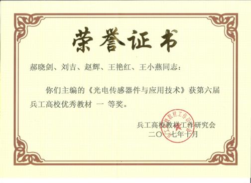 2017年第六届兵工高校优秀教材一等奖:《光电传感器件与应用技术》,主编郝晓剑