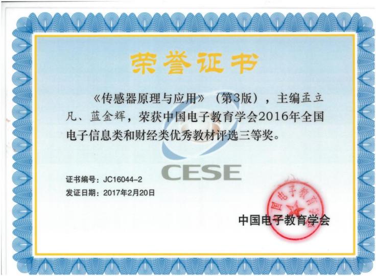 中国电子教育学会2016年全国电子信息类和财经类优秀教材评选三等奖:《传感器原理与应用第(第3版)》,主编孟立凡等