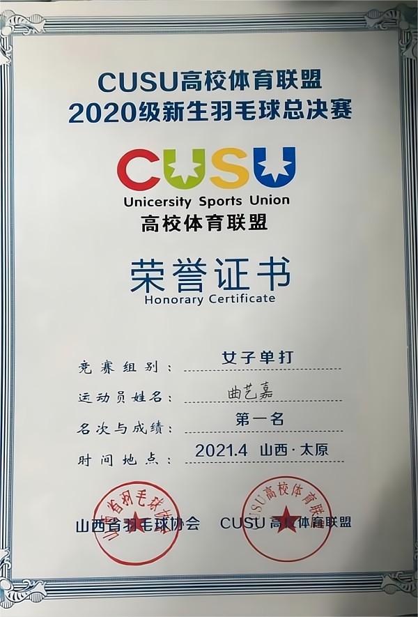 2021年曲艺嘉同学获CUSU高校体育联盟2020级新生羽毛球总决赛第一名